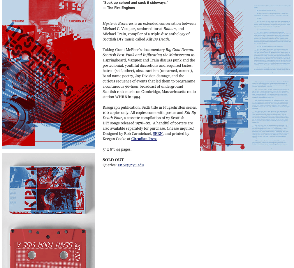 Risograph publication. Sixth title in Flugschriften series. 100 copies only. All copies come with poster and Kilt By Death Four, a cassette compilation of 27 Scottish DIY songs released 1978–82. A handful of posters are also available separately for purchase. (Please inquire.) Designed by Rob Carmichael, SEEN, and printed by Keegan Cooke at Circadian Press.